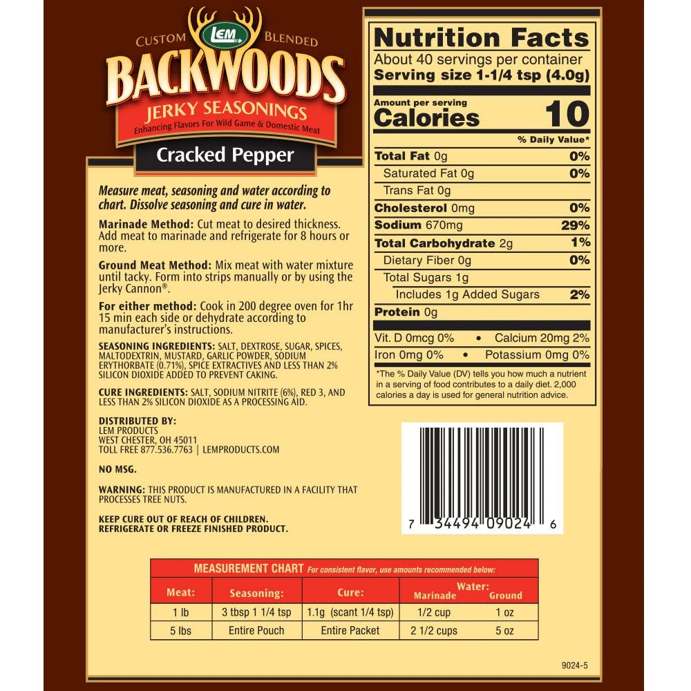 Cracked peppercorns add a kick. Contains mustard. Backwoods Jerky Seasonings have been delighting customers since 1991. We make it simple with our easy to follow instructions and pre-measured cure in every package. Marinate strips or mix with ground meat and use with our famous Jerky Cannon! For wild game and domestic meat.