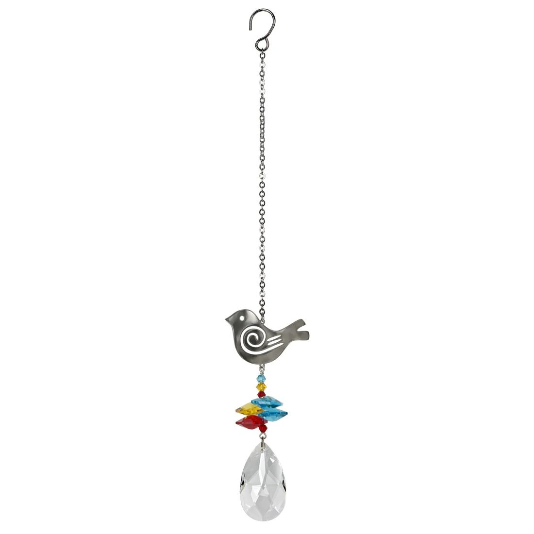 A large crystal is topped by a rainbow of small crystals and a silver bird. A bird’s ability to fly makes it a wonderful symbol of freedom. This bird is perched over a rainbow of crystals, which brings to mind the song from The Wizard of Oz: If happy little bluebirds fly beyond the rainbow, why oh why can’t I? Fly over your rainbow with this sweet Crystal Fantasy Bird. Not boxed, our Crystal Fantasies come ready to give with an organza gift bag. Recommended for indoor use. Woodstock Rainbow Makers do for light what our chimes to do for sound.