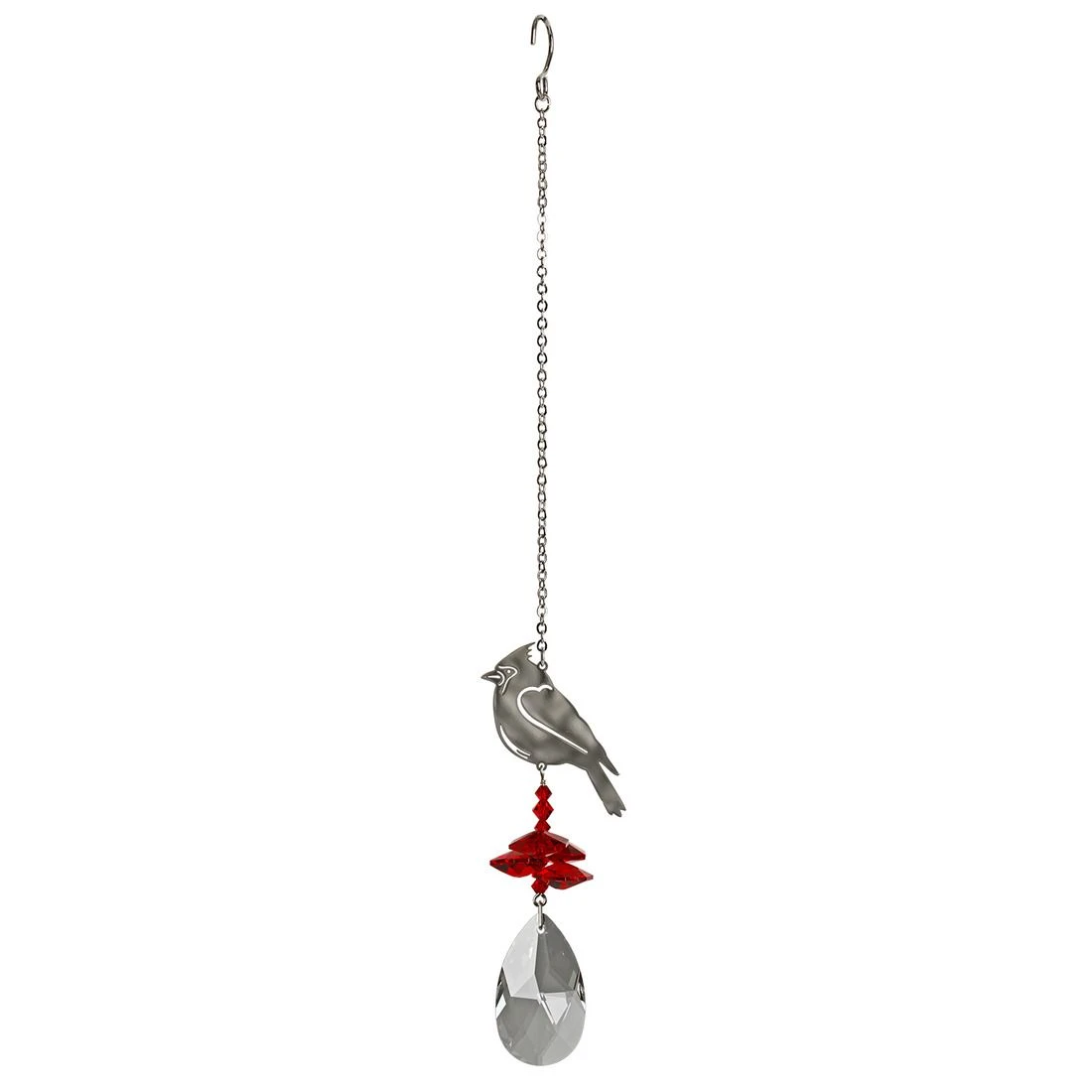 A large crystal is topped by smaller crystals and a silver cardinal. Seeing a cardinal in a dream means something positive is going to happen to you. This cardinal tops a cluster of crystals that sparkle and shine in the sun. Not boxed, this crystal suncatcher comes with a sheer organza gift bag. Recommended for indoor use. Woodstock Rainbow Makers do for light what our chimes do for sound.