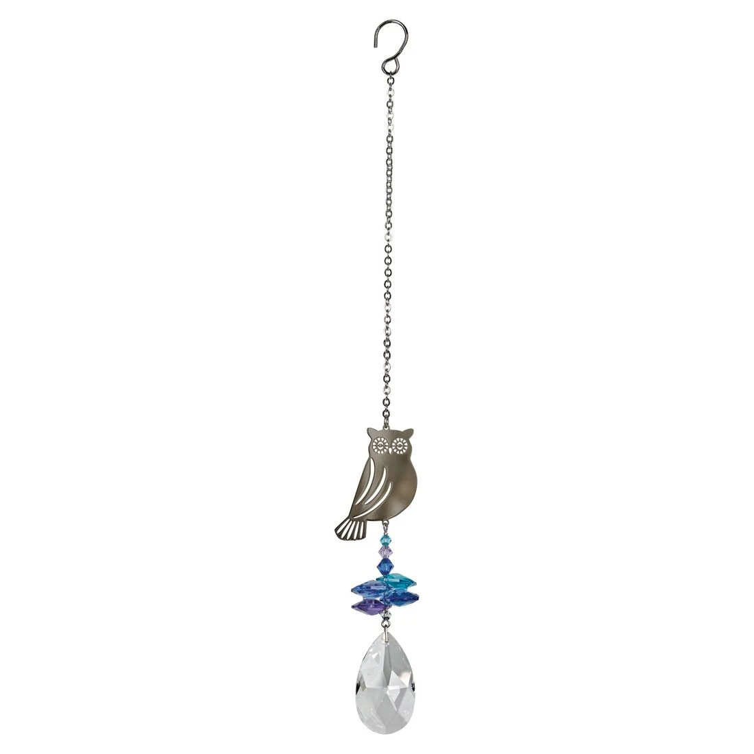 A large crystal is topped by smaller blue crystals and a wise silver owl. Owls have always represented wisdom, but they also symbolize the ability to cut through illusions and see the real meaning behind actions. The cascade of crystals are blue and purple, colors of the night, and the owl has big, bright eyes. Not boxed, our Crystal Fantasies come ready to give with an organza gift bag. Recommended for indoor use. Woodstock Rainbow Makers do for light what our chimes to do for sound.